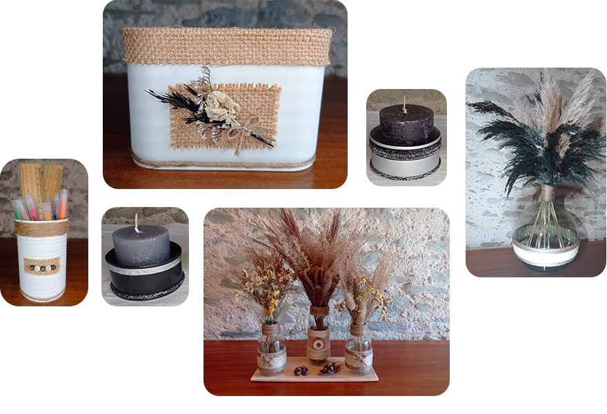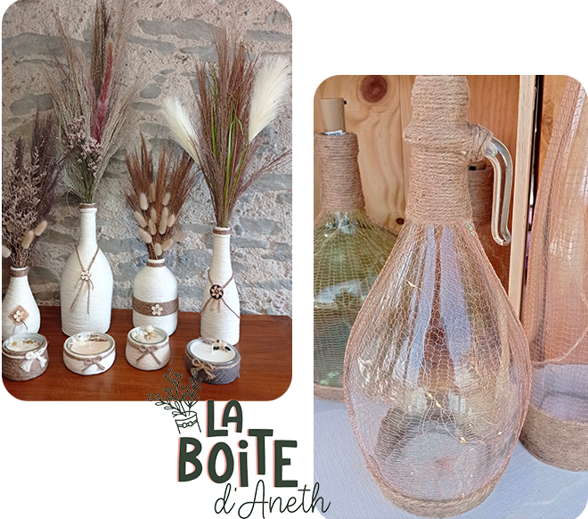 La collection de La Boîte d'Aneth reflète l'engagement écologique d'Anne. Ses créations intègrent des matériaux récupérés, témoignant de son souci de durabilité. Découvrez des objets décoratifs originaux, tels que des lampes fabriquées à partir de bouteilles en verre et des contenants faits de boites de conserves, décorées par exemple avec de la toile de jute et de la corde. Chaque pièce raconte une histoire unique, tout en soutenant l'upcycling et l'artisanat éco-responsable. L’entreprise La Boite d’Aneth à Le Boupère, vous invite à découvrir sa collection d’ objets décoratifs créés en Vendée pour ajouter une touche d'originalité à votre intérieur.