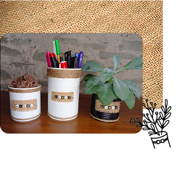 Pots de fleurs en boîtes de conservepeintes ou ornées de corde, toile de jute.
